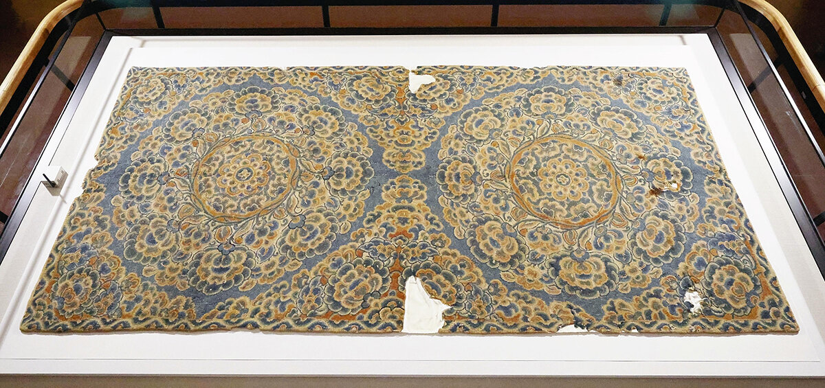 めまいがするほどの圧倒的な色彩と文様の複雑さ。正倉院に伝来する花氈(かせん)の中でも本作は傑作として名高い。